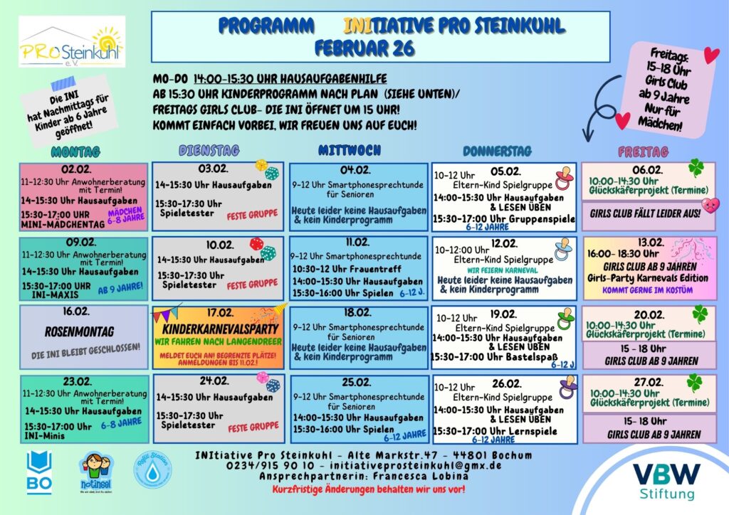 Die Einrichtung ist eine offene Tür für alle Menschen im Quartier Steinkuhl. Der Schwerpunkt unserer Arbeit liegt jedoch in der Förderung und Unterstützung der Kinder im Stadtteil. Die INItiative ist jeden Nachmittag verlässlich für Kinder zwischen sechs und zwölf Jahre von 14:00-18:00 Uhr geöffnet. Weitere Öffnungszeiten finden Sie immer weiter unten hier auf dieser Seite.